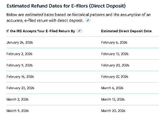 By federal law (the PATH Act), the IRS must hold refunds for tax returns claiming the Earned Income Tax Credit (EITC) or Additional Child Tax Credit (ACTC) until at least mid-February. For the 2026 season, the first wave of these refunds with direct deposit is generally expected by early March.